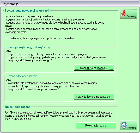 - automatyczne odczytywanie aktywnych licencji z serwera i rejestrację programu