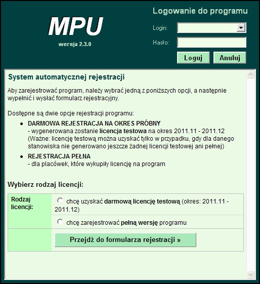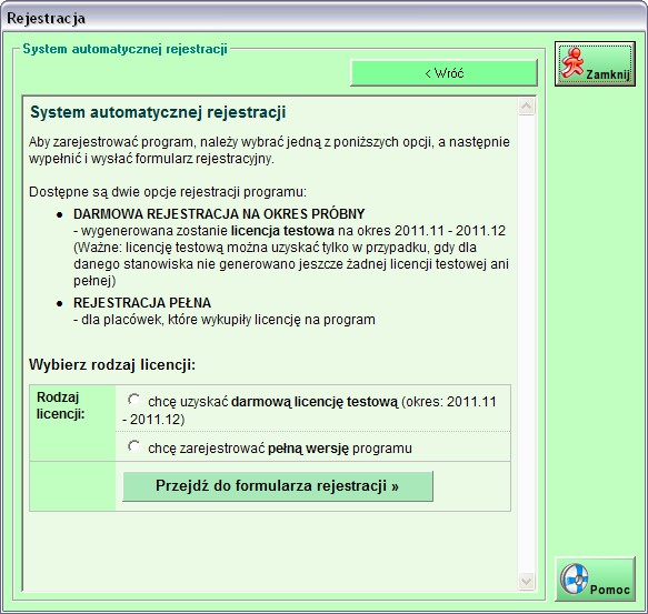 W wersjach niezarejstrowanych System dostępny jest już w oknie logowania do programu. Po kliknięciu przycisku 'Zarejestruj program' uruchomiony zostanie moduł rejestracji (rysunki poniżej).